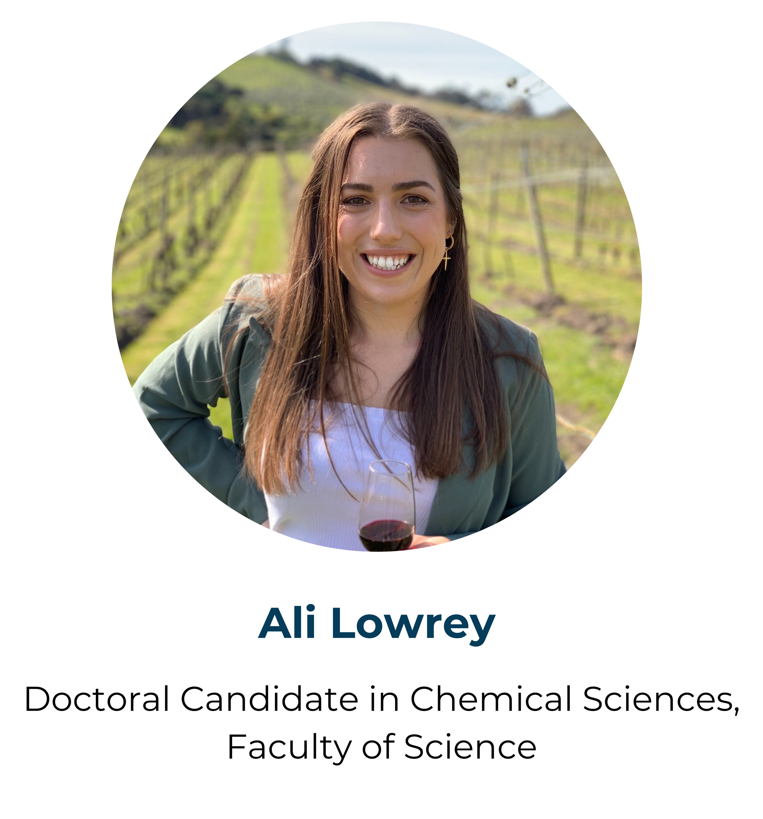 Alexandra (Ali) Lowrey is a PhD candidate in chemistry whose main research interest is vineyard soil chemistry and its connections to the grapevine and subsequent wine. More broadly she is interested in vineyard synthetic chemical applications, climate change and sustainability. Born in Hawke’s Bay, she has extensive local wine industry knowledge. The geographical basis of her research involves the two largest wine-producing regions in New Zealand, Marlborough and Hawke’s Bay. She completed her masters’ and postgraduate degrees at the University of Auckland’s Goldwater Wine Science Centre on Waiheke Island.